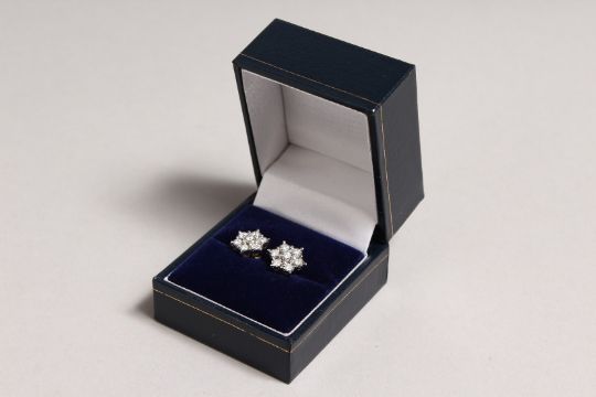 A GOOD PAIR OF 9CT GOLD AND DIAMOND CLUSTER EARRINGS.