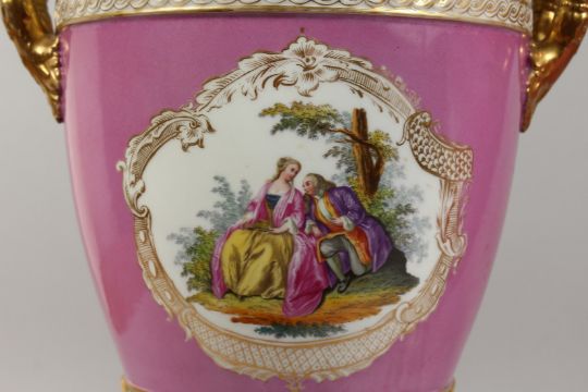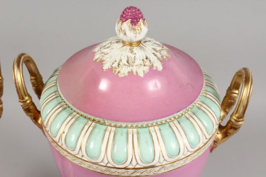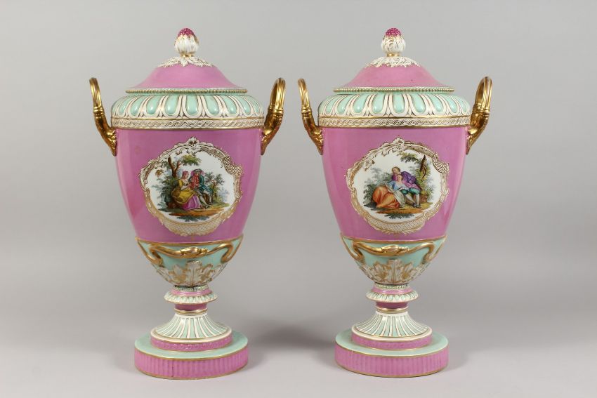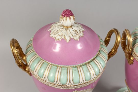A GOOD PAIR OF 19TH CENTURY BERLIN PORCELAIN TWO HANDLED URNS AND COVERS, rose pompadour ground edged in gilt with reverse panels of classical figures.