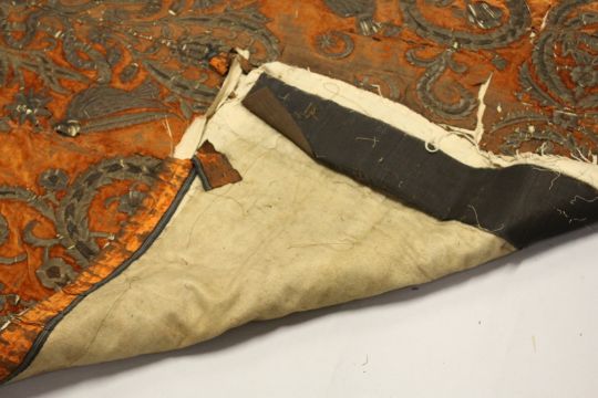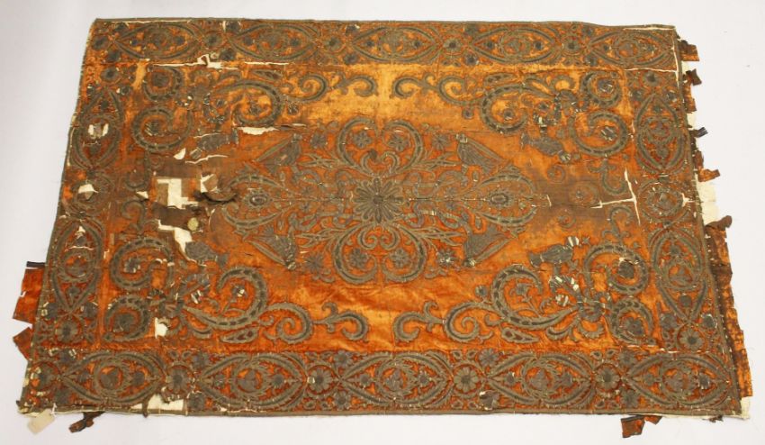 A RARE 18TH CENTURY, OR EARLIER, TURKISH METAL THREAD EMBROIDERED WALL HANGING, velvet ground with later lining, decorated with birds amongst foliage (AF).