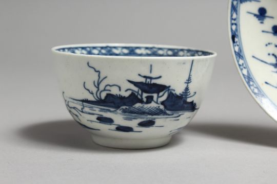 AN 18TH CENTURY WORCESTER TEA BOWL AND SAUCER painted with an island house, a rock and two trees surrounded by rocks in the water.