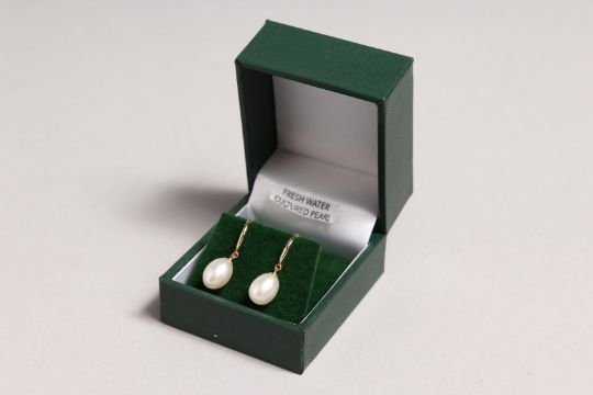 A PAIR OF 9CT GOLD CULTURED PEARL DROP EARRINGS.