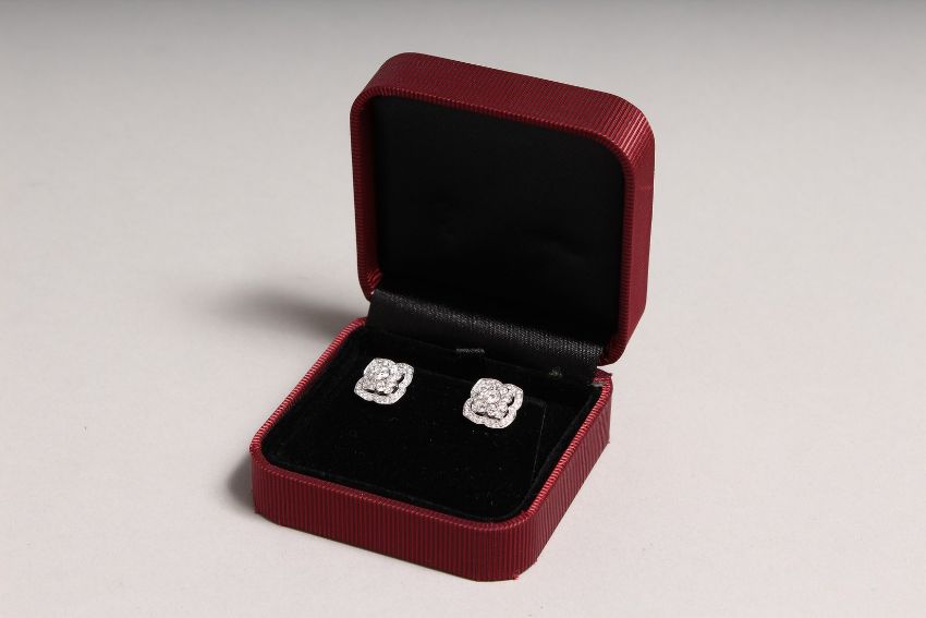 A VERY GOOD PAIR OF 18CT WHITE GOLD DECO DESIGN 1.5CT DIAMOND EARRINGS.