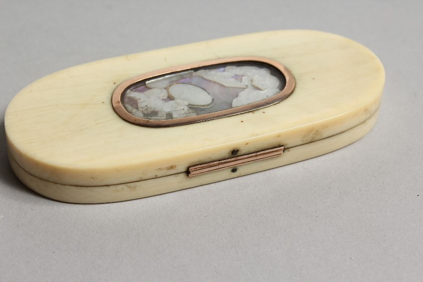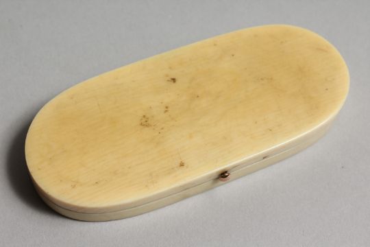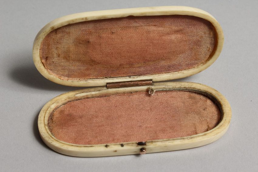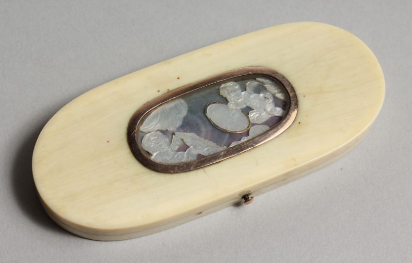 A GEORGIAN IVORY LONG PIN BOX, the top with two cupids.
