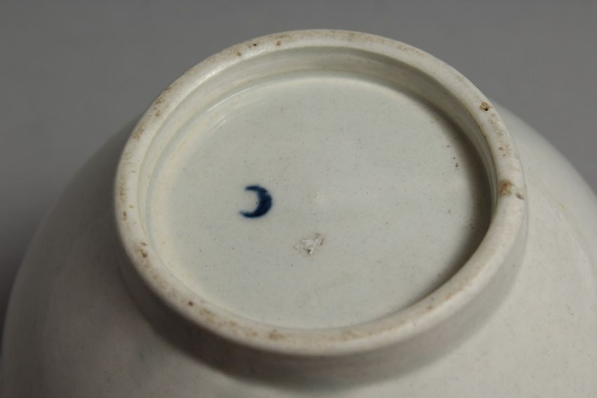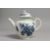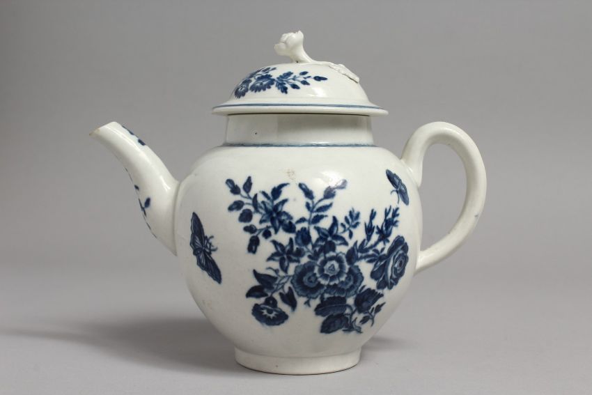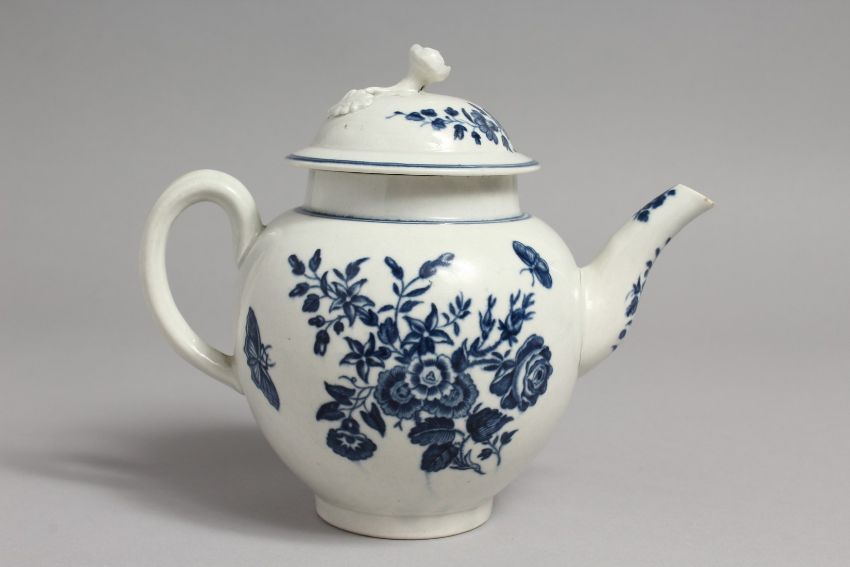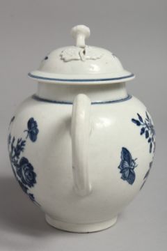 A WORCESTER BLUE AND WHITE PORCELAIN TEAPOT, the cover with floral knop, the body painted with floral sprays and butterflies.