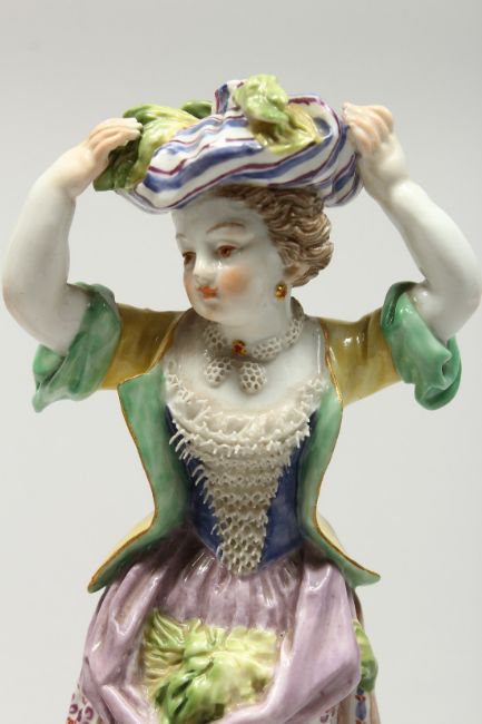 TWO SMALL MEISSEN PORCELAIN FIGURES OF YOUNG GIRLS holding a bundle above their head , with flowers in their aprons.