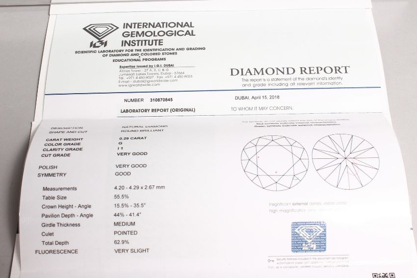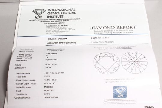 A SINGLE DIAMOND with International Gemological Institute diamond report, 0.29 carat, colour G.