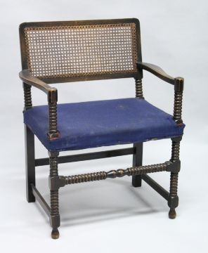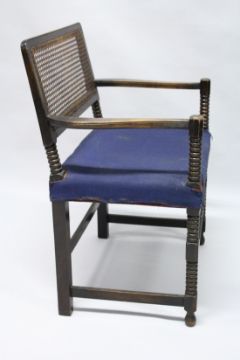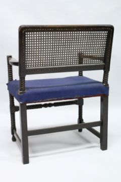A BEECH FRAMED BOBBIN TURNED ARMCHAIR, with cane work back and upholstered seat.