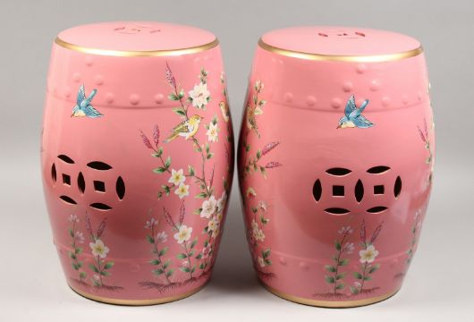 A PAIR OF PINK CHINESE PORCELAIN BARREL SEATS with flowers and birds.