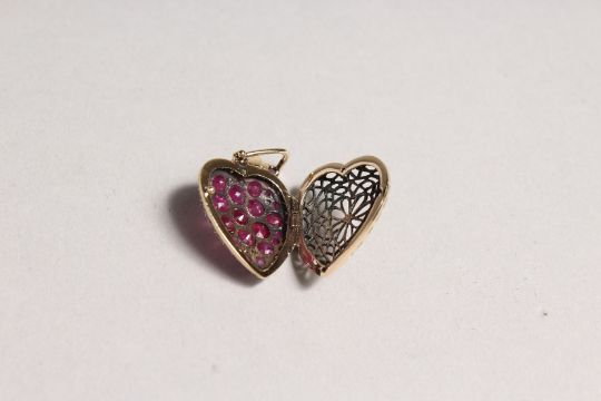 A GOOD 9CT GOLD, RUBY, AND DIAMOND HEART SHAPED LOCKET.