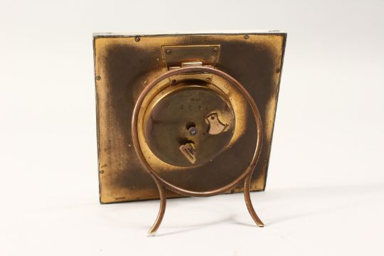 A SMALL FRENCH SILVER AND ENAMEL CLOCK by MAQUET, PARIS - NICE, with four panels of figures