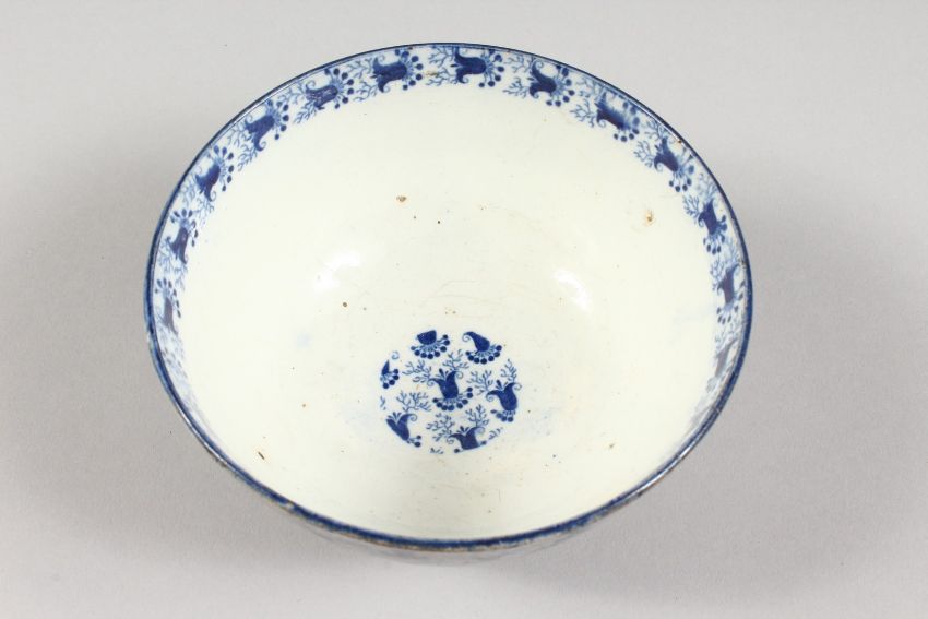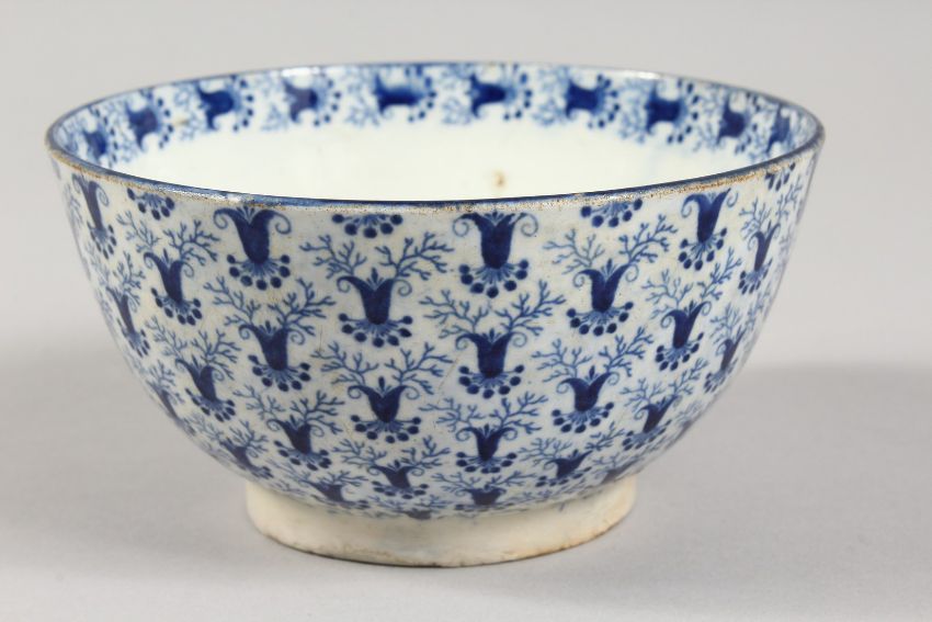 A 19TH CENTURY BLUE AND WHITE BOWL, painted all over with a stylised floral design.
