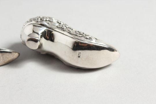 TWO SILVER SHOE PINCUSHIONS.
