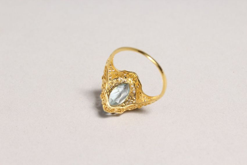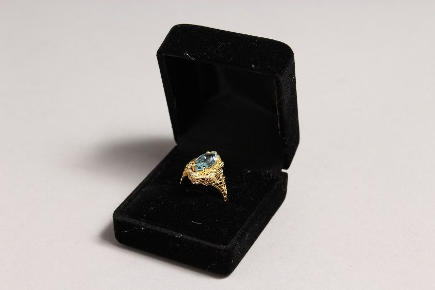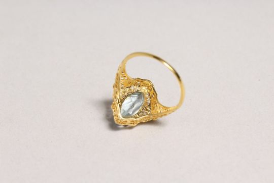 A SILVER AND GOLD TOPAZ SET RING.