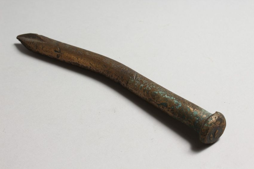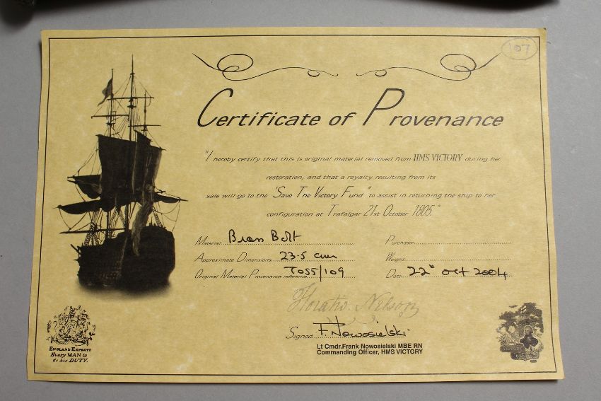 A HISTORICAL BRASS BOLT, 9.5ins long, removed from HMS Victory during restoration.