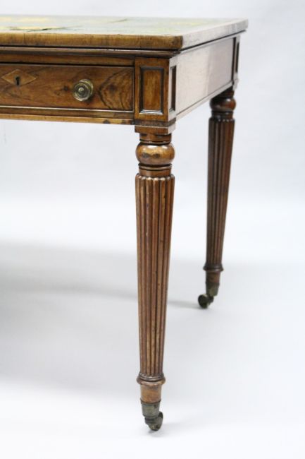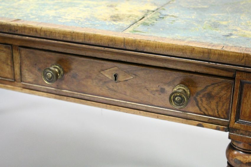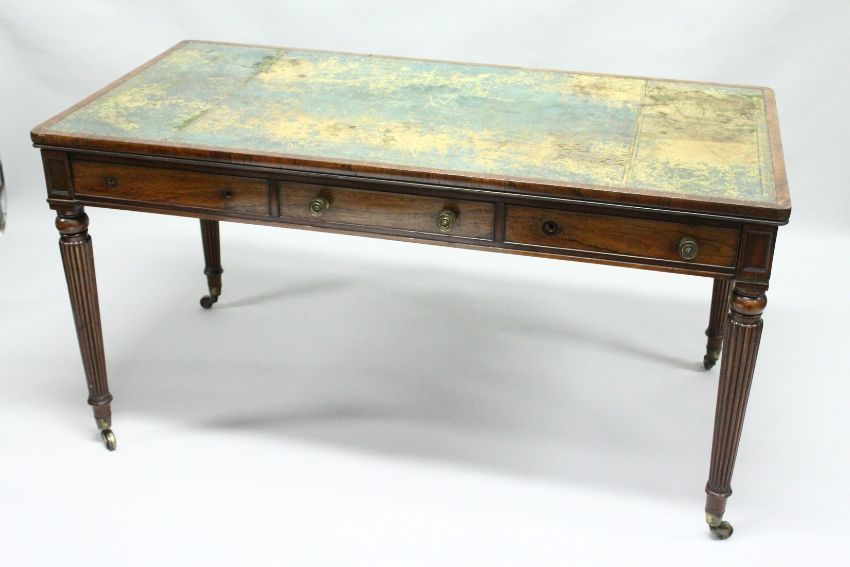 A GOOD 19TH CENTURY ROSEWOOD LIBRARY TABLE, in the Manner of GILLOW, with a distressed leather inset writing surface above three frieze drawers with three dummy drawers verso, on turned and reeded legs with brass castors.