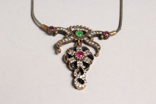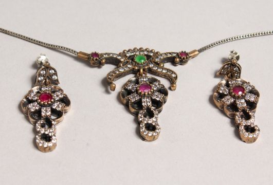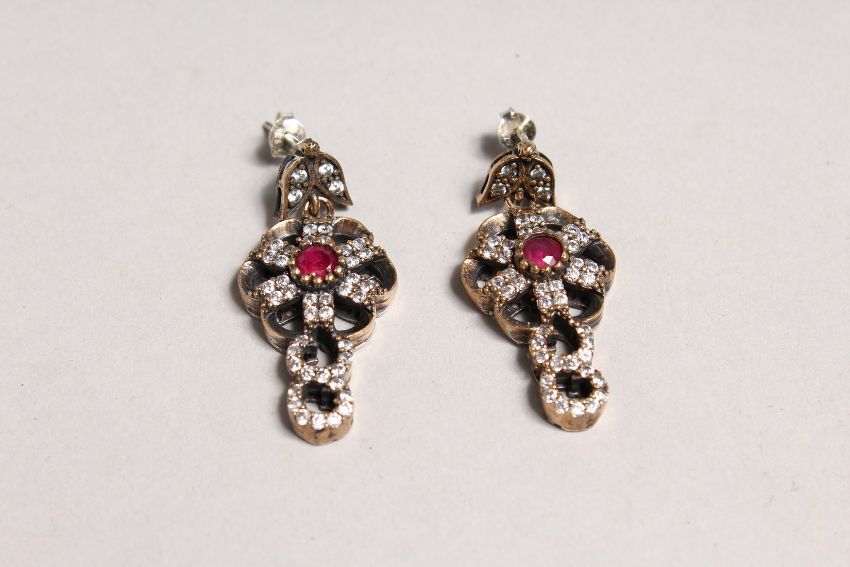 A SILVER VERMEIL CHALCEDONY EARRINGS AND NECKLACE.