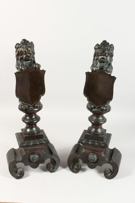 A SUPERB PAIR OF 19TH CENTURY BRONZE ANDIRONS with lion holding shields on curving feet.