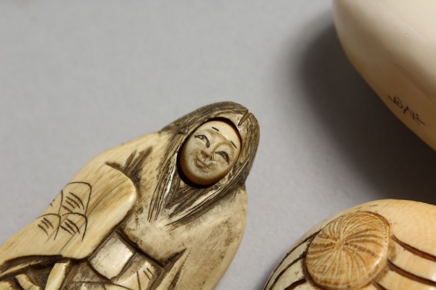 FOUR VARIOUS CARVED IVORY CHINESE NETSUKES, two masks, a figure and a duck.