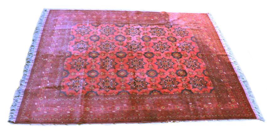 A GOOD PERSIAN CARPET, red ground with a design of large floral palmettes, within a similar border.