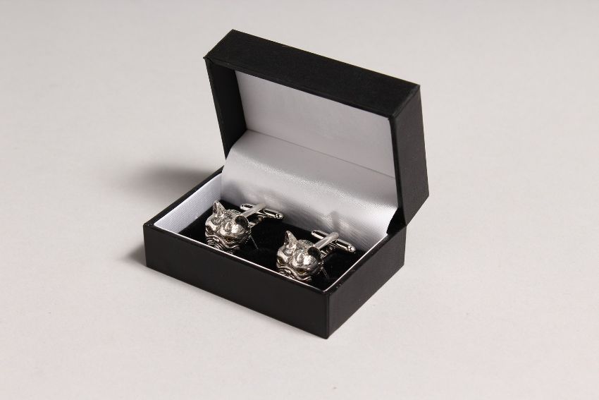 A PAIR OF SILVER BULLDOG CUFFLINKS.