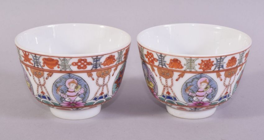 A PAIR OF UNUSUAL CHINESE PORCELAIN CUPS, painted with figures, animals and precious objects, the interior with famille rose flower, red mark to base, 8.5cm diameter.