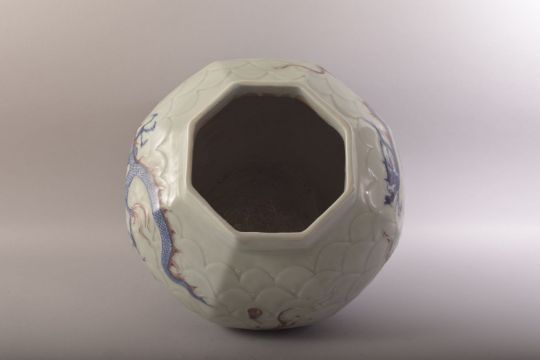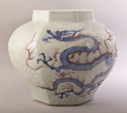 A CHINESE MING STYLE CELADON & IRON RED CARVED PORCELAIN JAR - decorated with scenes of dragons upon raised waved - 28cm high