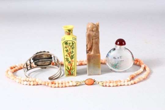 A MIXED LOT OF CHINESE ITEMS, comprising a coral type necklace, carved soapstone seal of shou lao, a silver bangle with turquoise, a reverse painted snuff bottle and a miniature vase. (5)