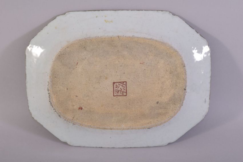 A CHINESE BLUE, RED AND WHITE / CLOBBERED RECTANGULAR PORCELAIN DISH, the centre painted with a river landscape including buildings, figures and trees, the base with mark, 32.5cm x 25cm.
