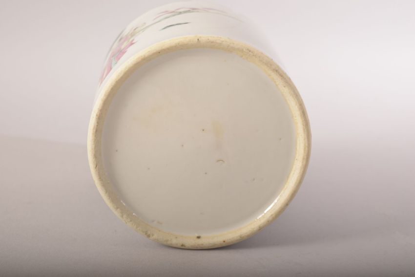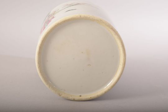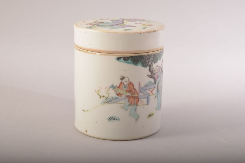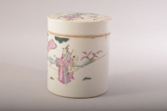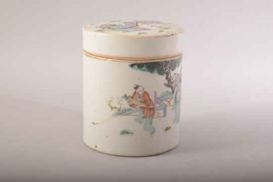 A CHINESE PORCELAIN CYLINDRICAL POT AND COVER, painted with figures in an outdoor setting, 12cm high.