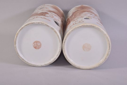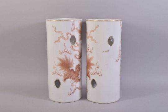 A SUPERB PAIR OF CHINESE RED AND WHITE PIERCED PORCELAIN HAT STAND VASES, the body of each painted with foo dogs and stylised flames, mark to each base, 28.5cm high.