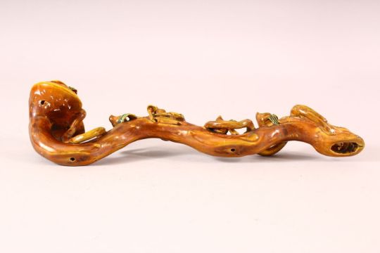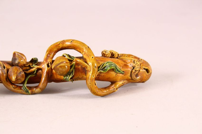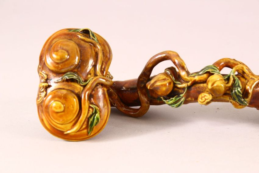 A CHINESE GLAZED PORCELAIN RUYI SCEPTER, naturalistically formed with moulded peach blossom, 34cm long.