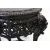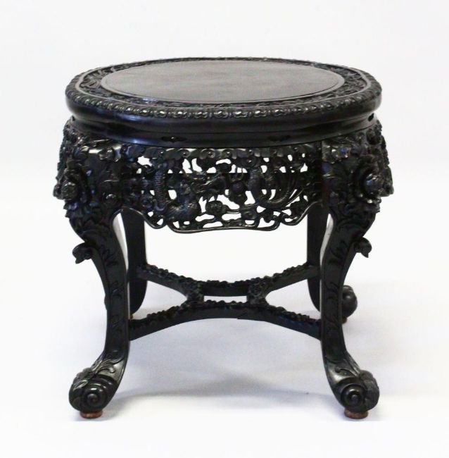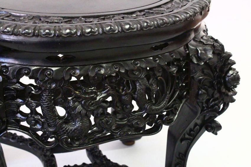 A SUPERB CHINESE CARVED EBONY STAND, the top border carved with bamboo, cherry blossom and lilies above and well carved and pierced frieze, depicting dragons chasing the flaming pearl of wisdom, supported on floral carved curving legs united by stretchers, 50cm diameter, 48cm high.