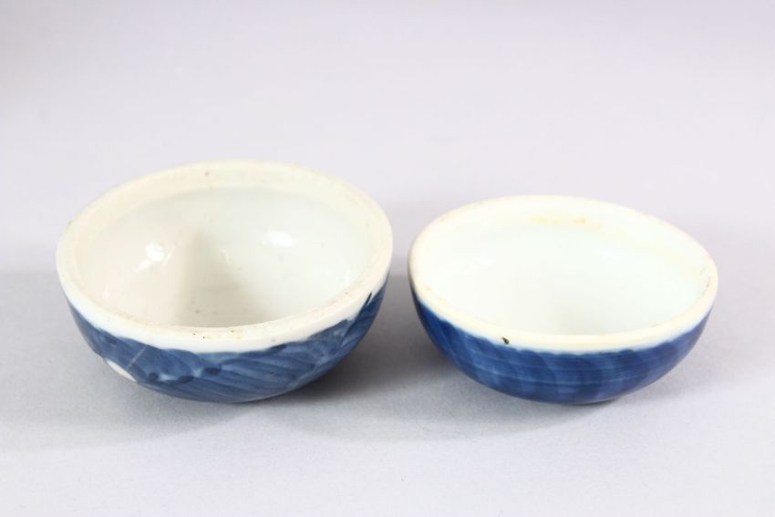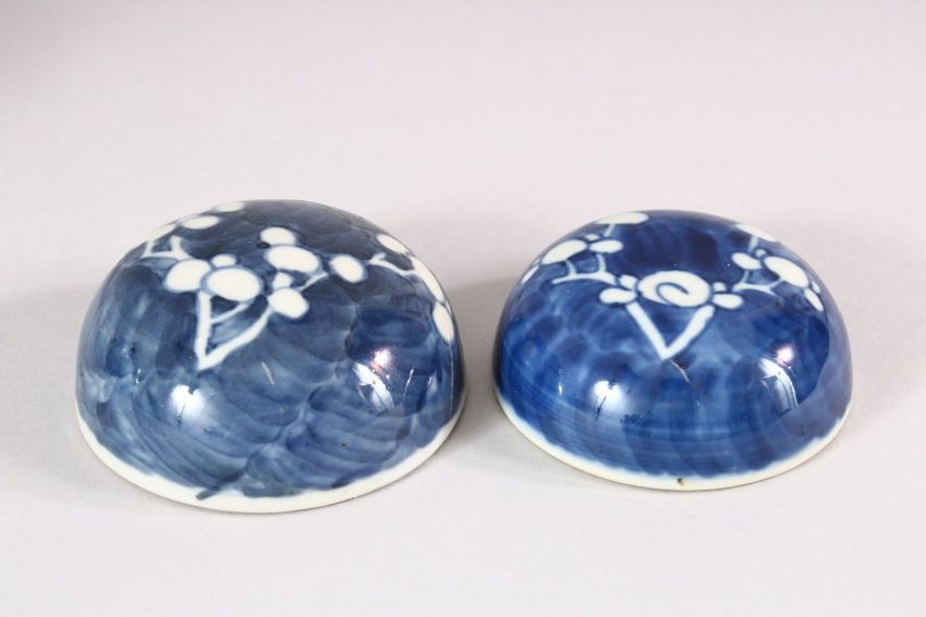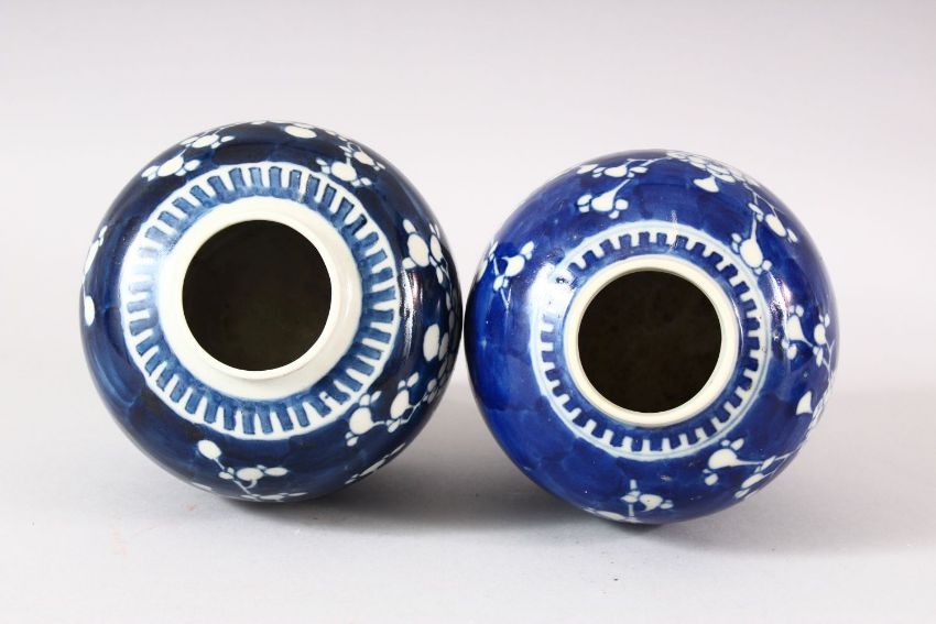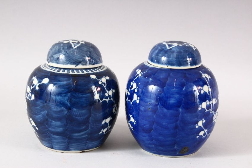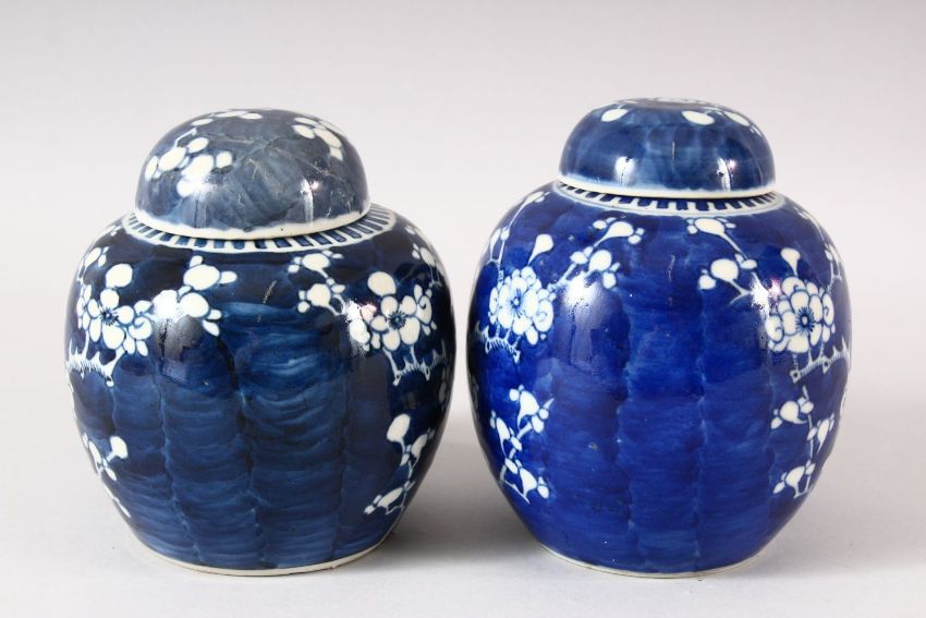 TWO 19TH CENTURY CHINESE BLUE & WHITE PORCELAIN GINGER JARS & COVERS - each decorated with the same prunus design, possible marriage of covers - 13cm