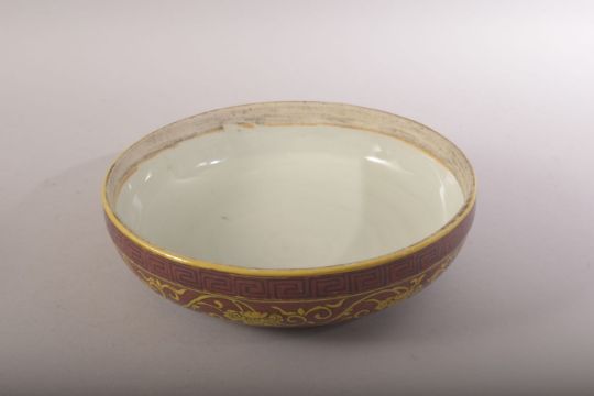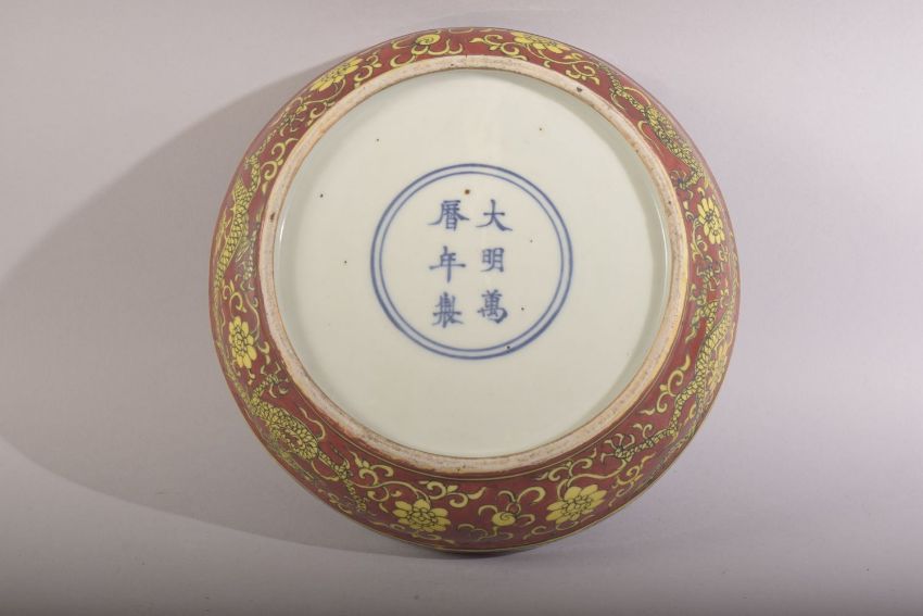 A CHINESE RED GROUND PORCELAIN CIRCULAR BOX AND COVER, painted with yellow dragons and flower heads amongst scrolling vine, six character mark to base, 19cm diameter.