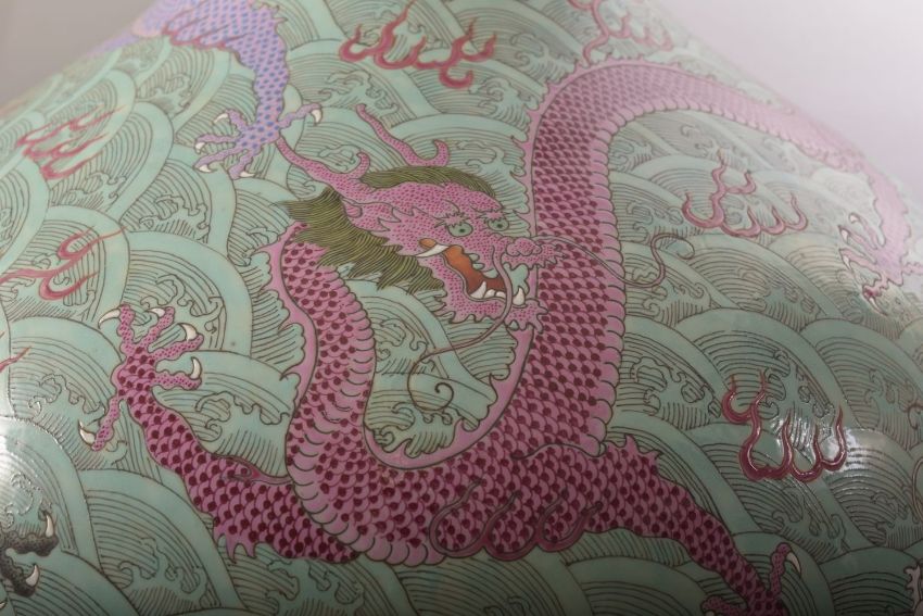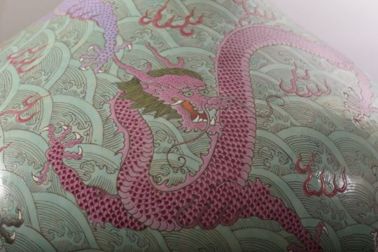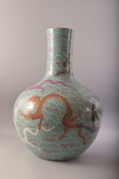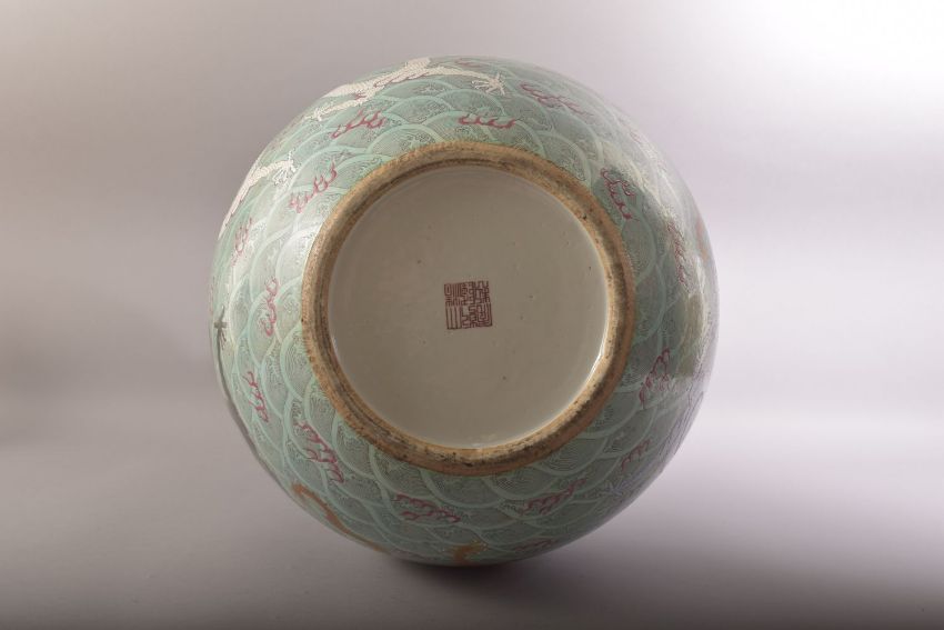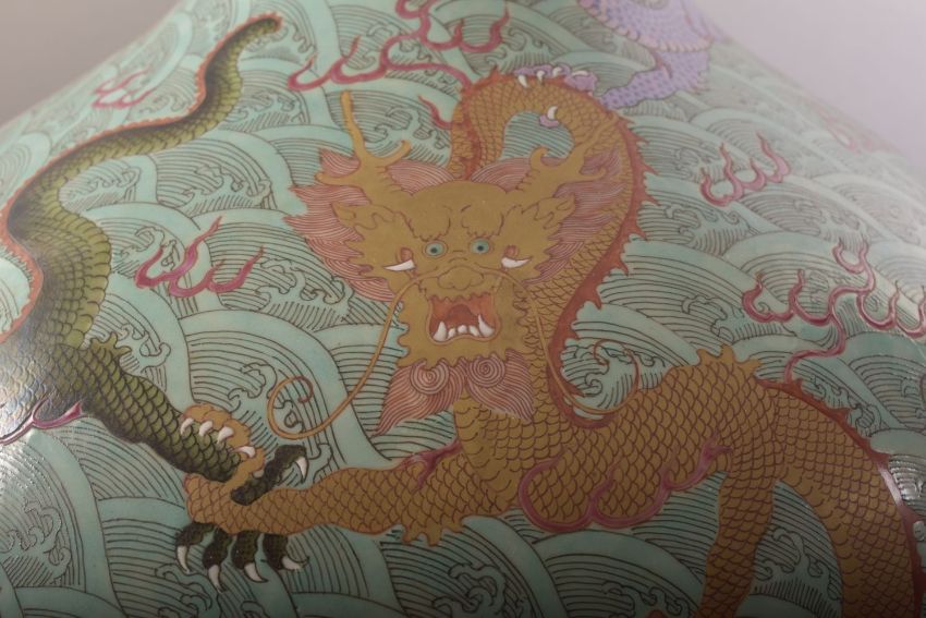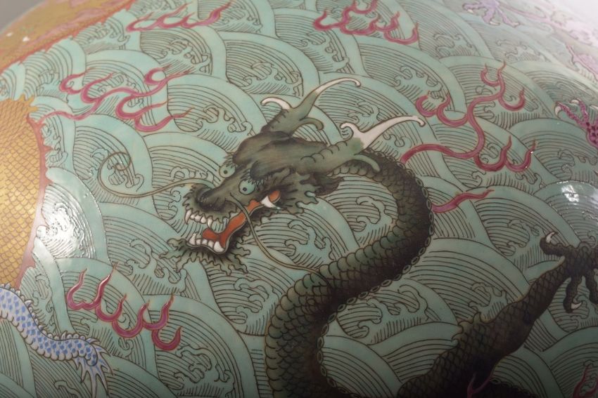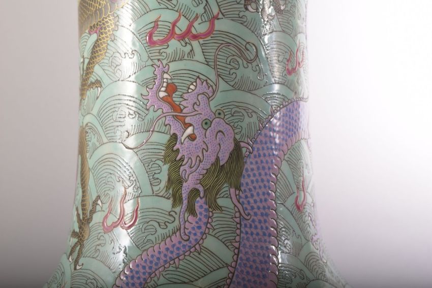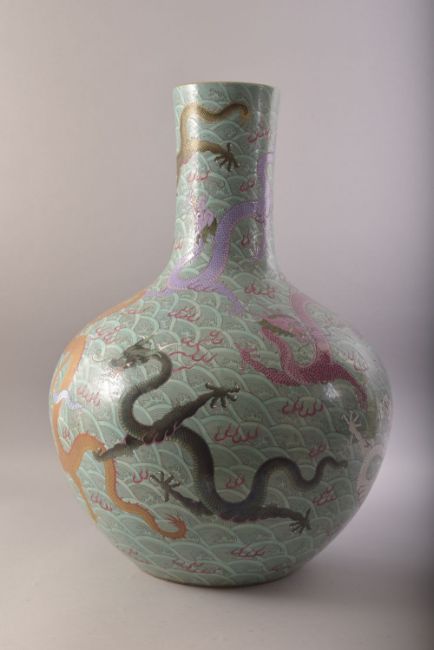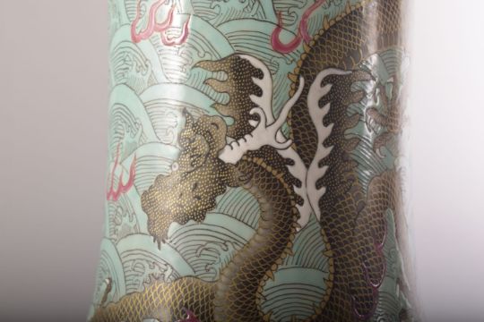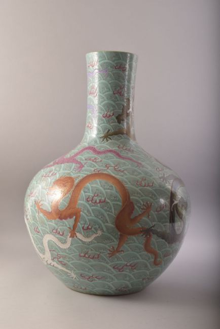 A LARGE AND IMPRESSIVE CHINESE TURQUOISE GROUND PORCELAIN VASE, decorated with multiple dragons and flame motifs against stylised waves, six character mark to base, 57cm high.