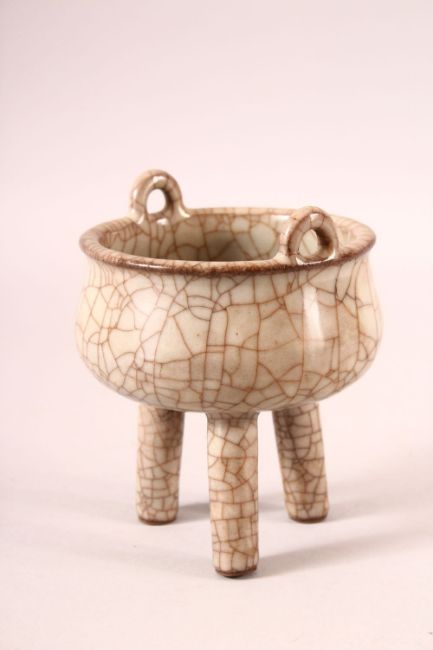 A CHINESE CRACKLE GLAZE TRIPOD CENSER, 15cm high, 12.5cm diameter.