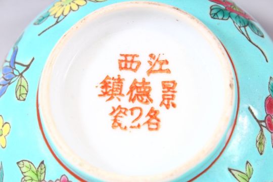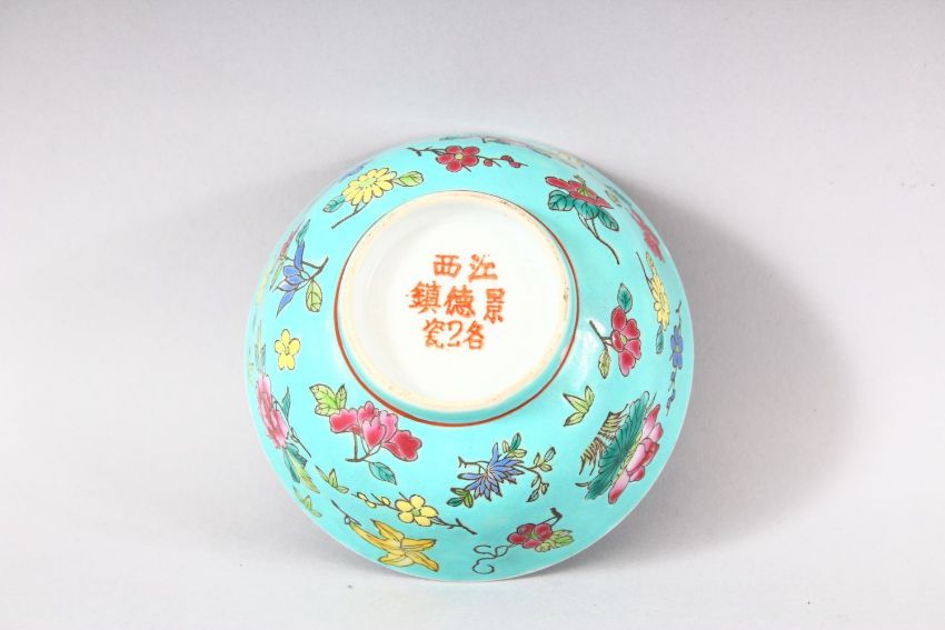 A CHINESE TURQUOISE GLAZED PORCELAIN BOWL - the turquoise ground with floral famille rose decoration, the base with a mark, 11.5cm