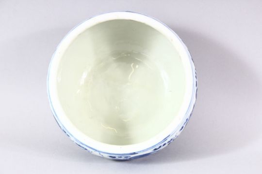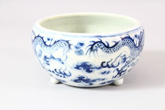 A CHINESE BLUE & WHITE PORCELAIN DRAGON BRUSH POT - with tripod feet, depicting dragons chasing the pearl, AF - restored , 17cm