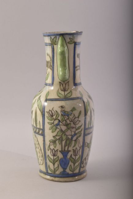 A PERSIAN QAJAR GLAZED POTTERY VASE, painted with figures, flowers and animals, 27.5cm high.