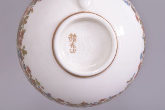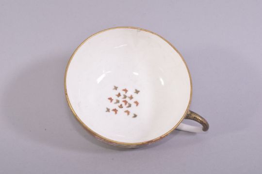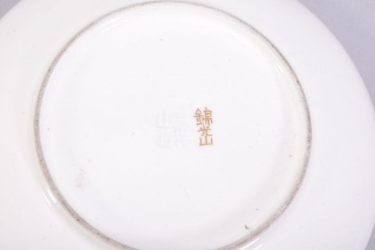 A SMALL JAPANESE KINKOZAN SATSUMA CUP AND SAUCER, finely decorated with bands of flowers, small butterflies and gilt highlights, with mark under glaze and gilt mark to base, cup rim 6.5cm diameter, saucer 10.5cm diameter.
