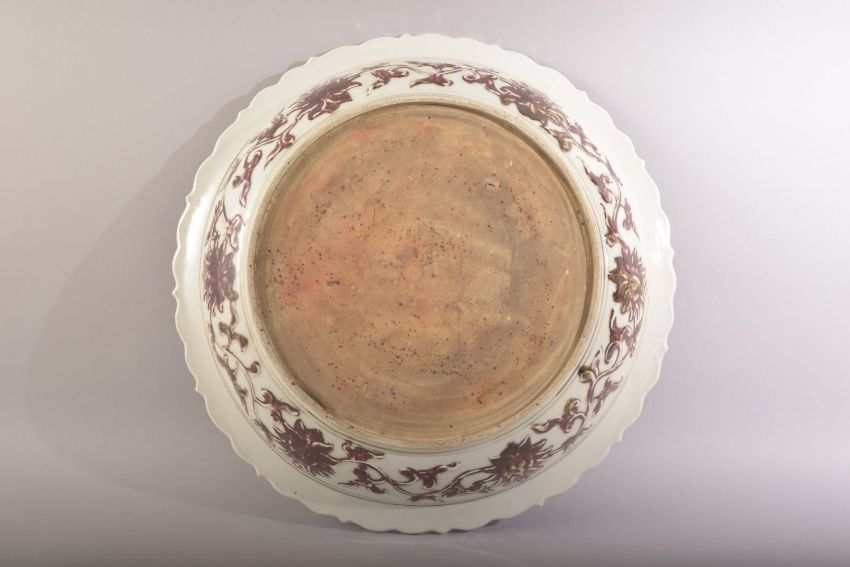 A LARGE CHINESE IRON RED UNDERGLAZED DRAGON DISH, decorated with a large dragon amongst stylised clouds to centre, 41cm diameter.