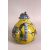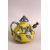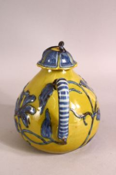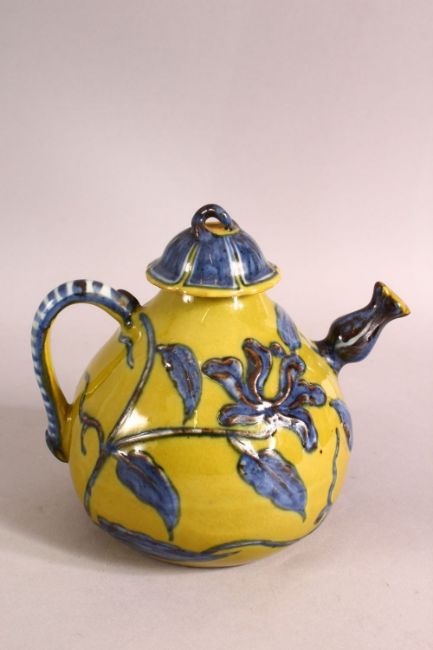 A CHINESE YELLOW GROUND GLAZED POTTERY TEAPOT AND COVER, the body with blue floral decoration, 15cm high, 16cm wide (spout to handle).