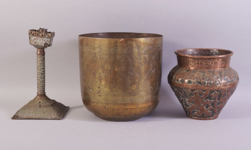 THREE ISLAMIC BRASS / METALWARE ITEMS, comprising a embossed and chased copper vase, an engraved brass basin and a bronze candlestick, various sizes (3).