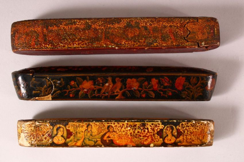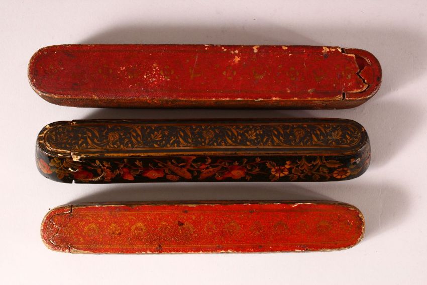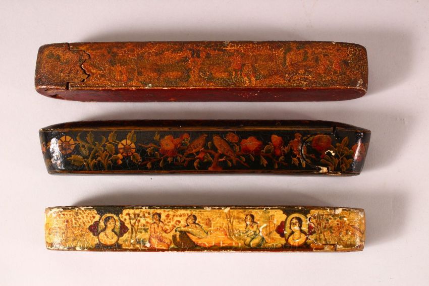 THREE 19TH CENTURY PERISAN QAJAR LACQUER PEN BOXES - QALAMDANS - each with varying painted decoration - largest 23cm