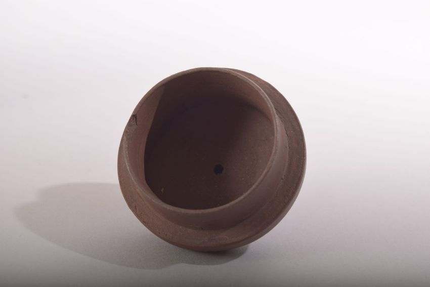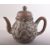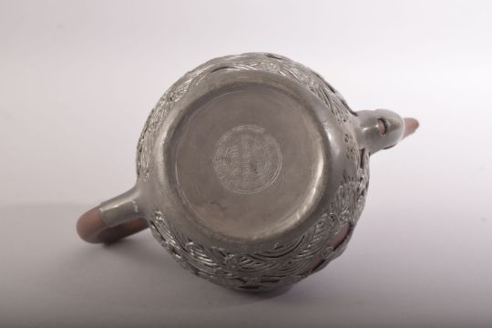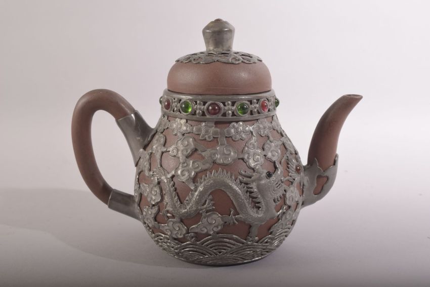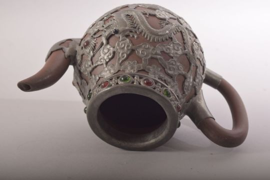 A CHINESE YIXING TEAPOT, with metal mounts and inlaid rim, impressed mark to metal base, 15cm high.