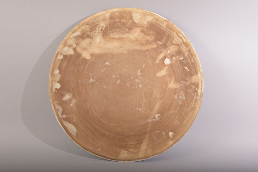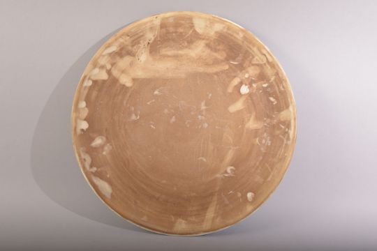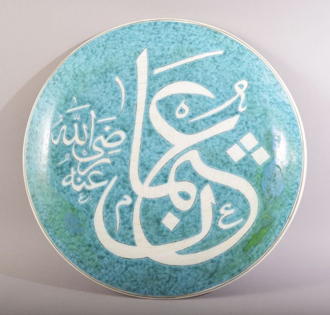 A CIRCULAR GREEN GLAZED CALLIGRAPHIC MOSQUE PLATE, 33cm diameter.