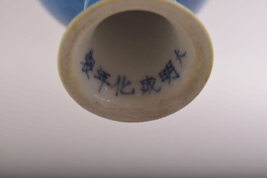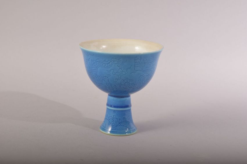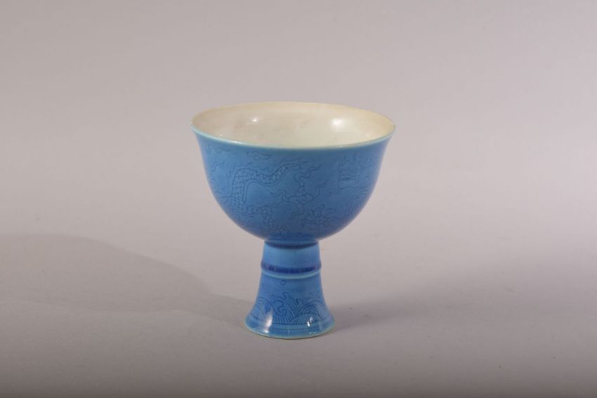 A CHINESE MING STYLE TURQUOISE DRAGON CUP - the body incised with dragons and the base with a six character mark - 8.5cm