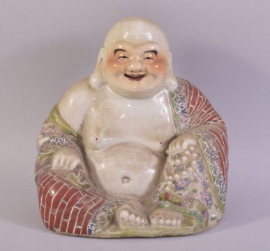 A CHINESE FAMILLE ROSE PORCELAIN FIGURE OF BUDDHA, with impressed mark to base, 23cm high.