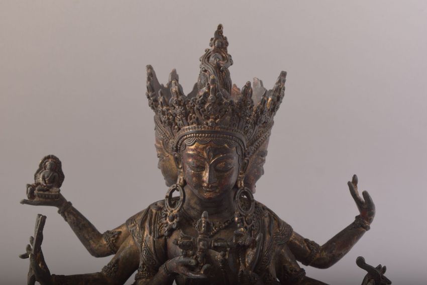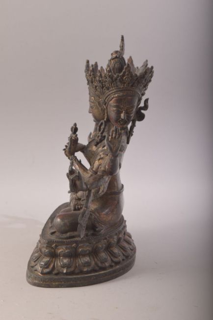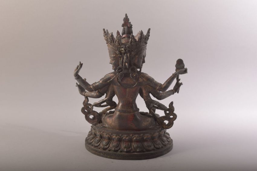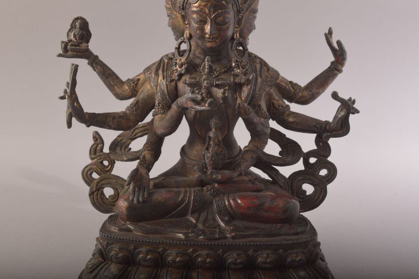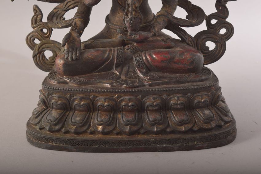 A TIBETAN GILT BRONZE FIGURE OF A MULTI ARM DEITY / BUDDHA - in a seated position holding many objects - base with a mark - 30cm