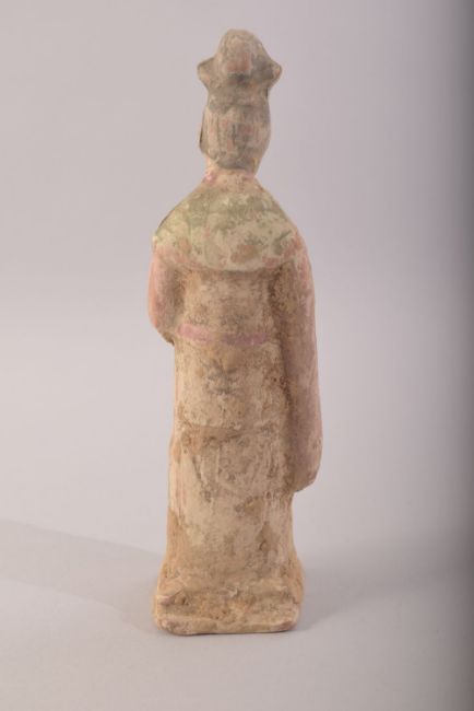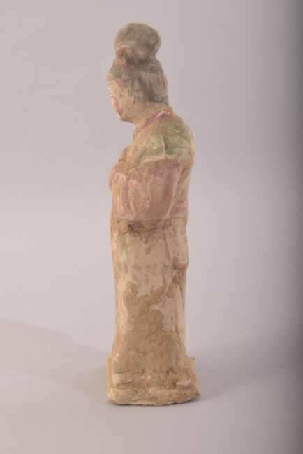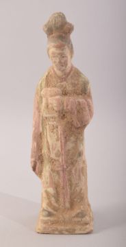 A CHINESE TERRACOTTA STANDING FEMALE FIGURE, 18cm high.